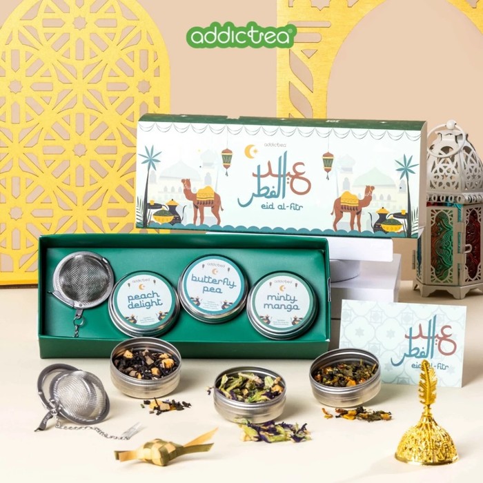 Teh seringkali dipilih sebagai minuman untuk menemani obrolan selama silaturahmi lebaran maupun ketika sedang bersantai. Dengan kemasan yang apik, Addictea Hampers ini bisa dijadikan pilihan untuk diberikan pada para pencinta teh.