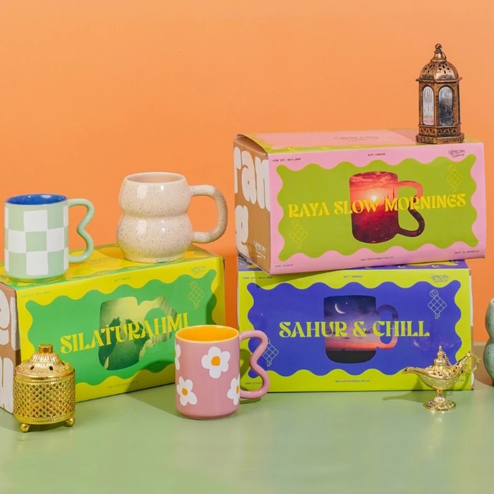 Ide hadiah lebaran lainnya ada pasangan mug keramik cantik dari Capricorn Homeliving. Hadir dengan warna-warna pastel, design mug yang ditawarkan juga unik dan lucu. Mug ini juga dikemas dengan box yang tidak kalah gemas.