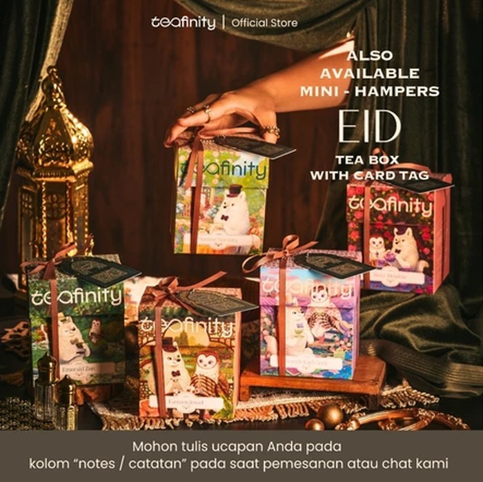 Ide pertama adalah Mini Hampers Tea Box with Card Tag Ramadan Lebaran dari Teafinity Official Store. Harganya terjangkau, yaitu mulai dari Rp78 ribuan saja yang ramah di kantong.