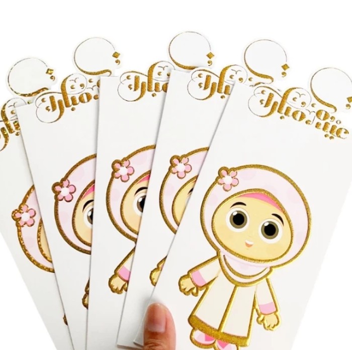 Dengan ukuran 9 x 17 cm, satu pack-nya berisi lima amplop dengan karakter kartun bertema Islami yang menggemaskan. Desainnya yang eye-catching pasti membuat anak-anak semakin excited saat menerima THR!