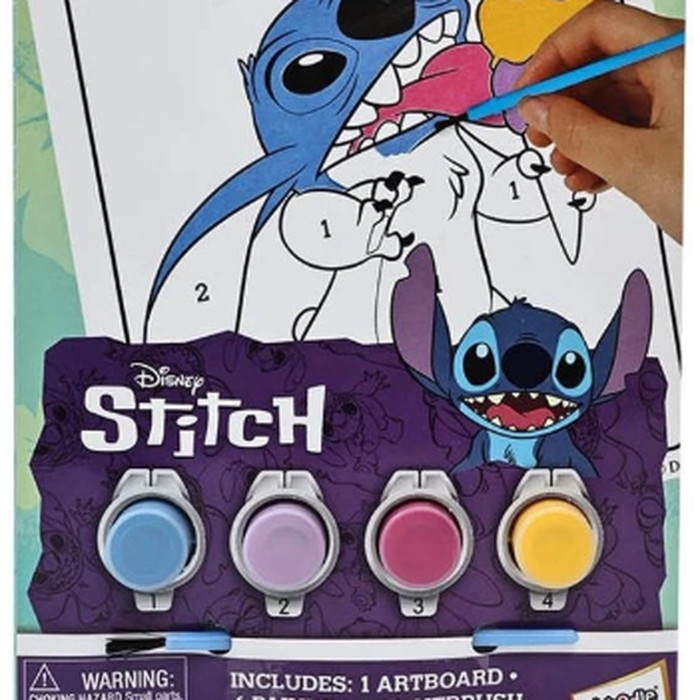 Salah satu ilustrasi yang anak-anak sukai ada karakter Stitch yang lucu. Anak-anak bisa melukis sesuai dengan angka yang tertera pada artboard dan menyesuaikan dengan cat warnanya. Tetapi anak-anak bebas berkreasi kok, pakai warna yang beda, nggak masalah!