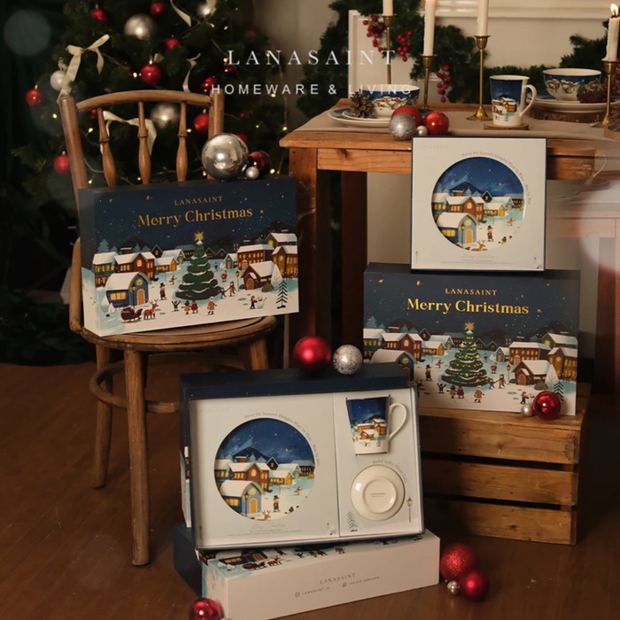 Set peralatan makan dari Lanasaint terbuat dari bahan porselen berkualitas dengan hiasan rumah natal bernuansa biru putih. Dalam satu kotak hampers lengkap berisikan 4 macam, yaitu 1 pcs piring ukuran 27 cm dan 20 cm, 1 pc mangkuk ukuran 14 cm, dan 1 pc mug ukuran 350 ml. Beauties juga akan mendapatkan kartu ucapan gratis untuk setiap pembelian. Jadi, kamu tidak perlu repot-repot menulisnya secara terpisah.