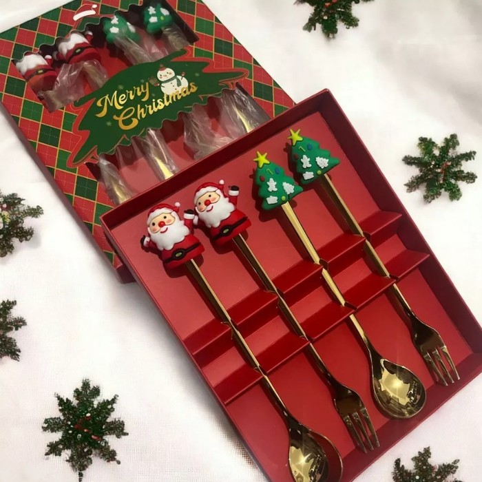 Set peralatan makan bisa menjadi hadiah alternatif yang bermanfaat tentunya. Terbuat dari bahan premium anti karat dan luntur dengan lapisan gold asli 24K yang tebal dan halus. Set peralatan makan ini dilengkapi hiasan bertema natal di bagian atas yang membuatnya terlihat makin menggemaskan.