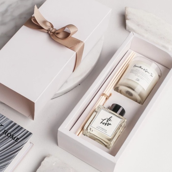 Lilin aromaterapi dan diffuser dapat digunakan untuk memberikan aroma menenangkan di dalam ruangan dan bermanfaat untuk meningkatkan suasana hati. Terdiri dari satu buah lilin aromaterapi dan diffuser yang dikemas menggunakan box putih sehingga membuat tampilannya terlihat mewah. Terdapat berbagai pilihan aroma, seperti sakura & pear, pine & cedarwood, lavender, jasmine, clean cotton, hingga white rose.