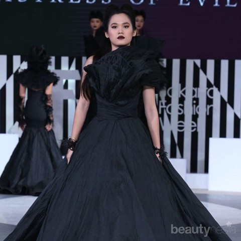 Foto: https://www.instagram.com/jfwofficial/Desain sang tokoh utama, Maleficent, dirancang Andreas Ondang dengan muse aktris sekaligus penyanyi Sheryl Sheinafia. Maleficent identik dengan gaya serba hitam dan karakter yang kuat. Mengenakan gaun hitam dengan aksen tumpuk di bagian dada dan punggung, Sheryl tampak anggun, tegas, juga memukau. Gaun tersebut mampu menghipnotis penonton JFW 2020.