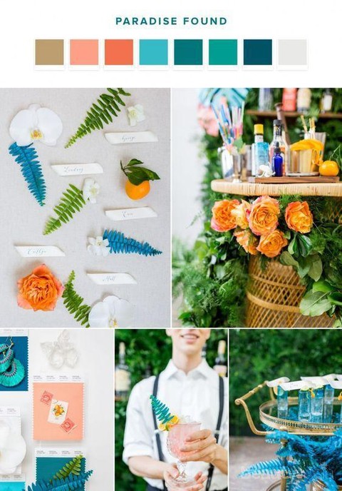 Warna oranye terang, warna cokelat kayu, biru cerah dan percikan warna hijau toska yang menyegarkan akan menemani palet bertemakan ini. Selain warna dengan nuansa pantai, paradise found juga mempersentasikan warna koktail yang romantis. Ditambah dengan hiasan bunga-bunga yang berwarna terang. Dengan konsep warna ini, kamu akan membuat para tamu mengalami pengalaman yang berbeda dari biasanya.
