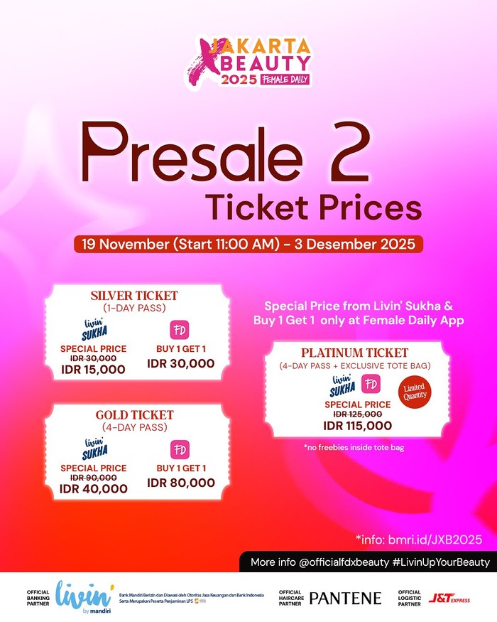 Jakarta x Beauty 2025 jadi event kecantikan terbesar yang diadakan oleh Female Daily Network. Event ini jadi kesempatan buat para beauty enthusiast karena akan ada 400 lebih brand kecantikan lokal maupun internasional dengan berbagai promo menarik, mulai dari diskon hingga freebies. Selain itu, event ini juga menawarkan berbagai aktivitas lainnya, seperti School of Beauty, beauty mission, hingga music performance. Acara ini diselenggarakan di Jakarta International Convention Center. Harga tiketnya mulai dari Rp 30.000.