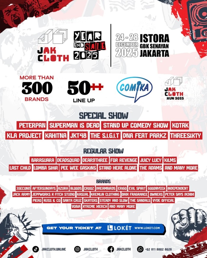 Jakcloth Year End Sale, festival pakaian dan gaya hidup terbesar di Indonesia. Lebih dari 300 brand, 50 lineup musik, dan stand up comedy show akan diselenggarakan di Istora GBK Senayan/Foto: instagram.com/jakcloth