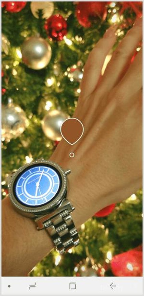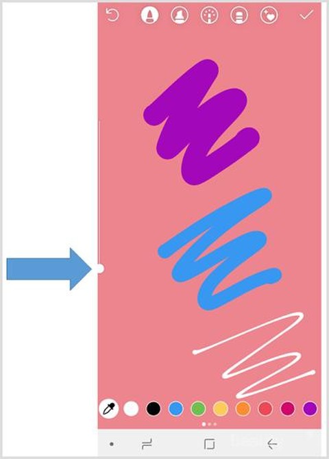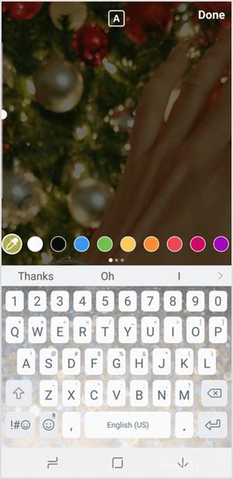 Nah, cara yang kedua adalah menggunakan color dropper icon yang berada di paling ujung kiri dari palet warna. Icon ini akan menyembunyikan keyboard screen dan membawamu ke gambar yang telah diupload. Kamu bisa menekan area manapun yang kamu suka untuk mengambil warna dari pixel di layar. Setelah kamu memilih warna, kamu akan kembali ke keyboard screen untuk menambahkan warna tersebut ke dalam teks.