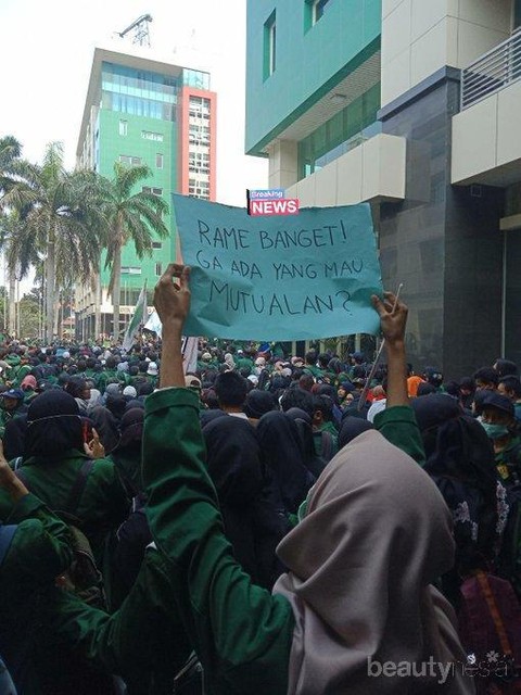Foto: https://twitter.com/AnissaPuspitaS/Nah, kalau yang satu ini menggambarkan anak twitter banget, ya. Mutualan sendiri adalah istilah yang mengacu ke ajakan berteman di twitter. Ribuan orang yang ikut melakukan aksi demo membuat sang penulis spanduk menawarkan untuk 'mutualan' alias berteman.
