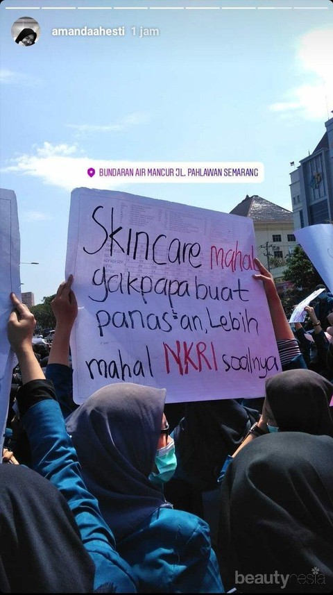 Foto: https://twitter.com/widyayolandaSama seperti sebelumnya yang rela turun ikut aksi demonstrasi, penulis spanduk yang satu ini pun tak mempermasalahkan rutinitas skincare-nya yang mahal. Hal itu dilakukan karena ia ingin memperjuangkan NKRI.