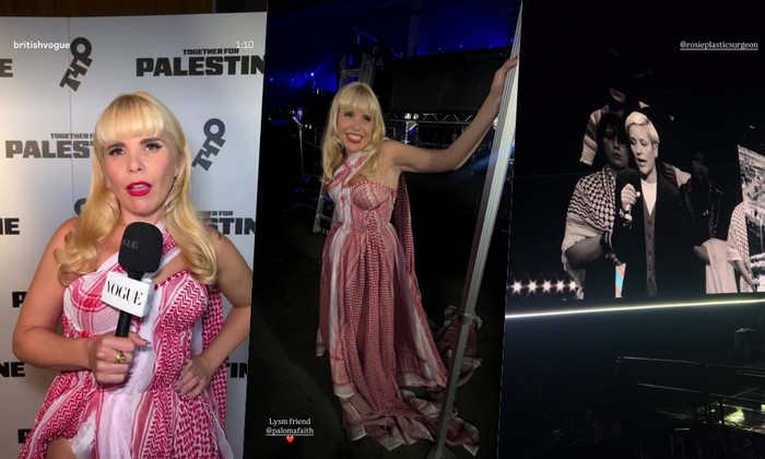 Malak Mattar dan Es Devlin hadirkan seni panggung penuh makna, sementara Paloma Faith kenakan gaun keffiyeh di konser Together for Palestine./Foto: Instagram/munroebergdorf