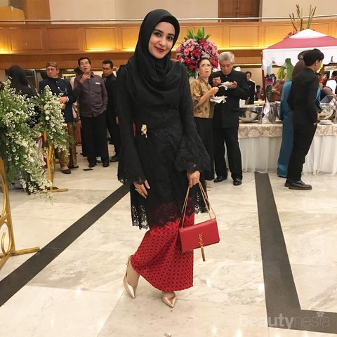 Sebagai salah satu artis Indonesia berhijab, Shireen juga sangat pandai memilih model dan padanan yang pas untuk ke pesta. Meski untuk kegiatan formil seperti acara pesta, Shireen juga tidak melupakan gaya santun berhijab dengan membuat kebaya panjang hingga bagian paha. So chic!