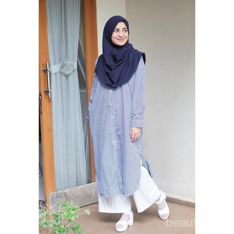 Dalam gaya fashion lainnya Shireen juga mengenakan outfit simple seperti tunik yang dipadankan dengan palazzo pants berwarna putih. Untuk melengkapi gaya kasualnya, Shireen menambahkan sepatu sendal platform dengan warna yang senada dengan celana.