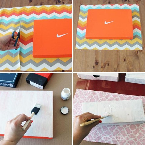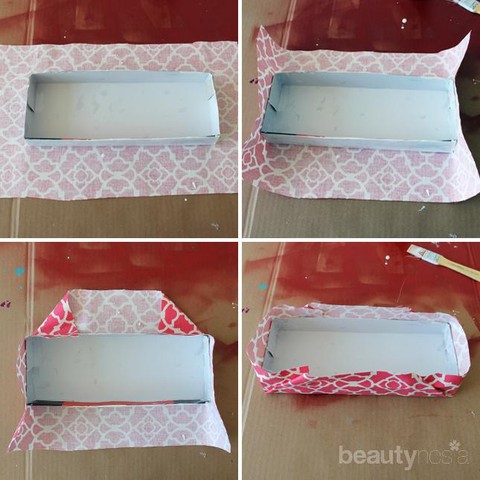 1. Mulailah dengan menggunting kain berukuran kira-kira dapat menutupi kotak sepatu. Sebelumnya, cat dulu kotak sepatu dengan cat putih agar logo atau warna tak mengintip dari balik kain. Setelah kering, oleskan lagi dengan Mod Podge.