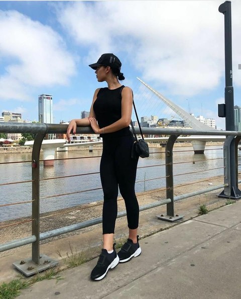 enakan busana serba hitam, mulai dari top, legging, sneakers, hingga sling bag.