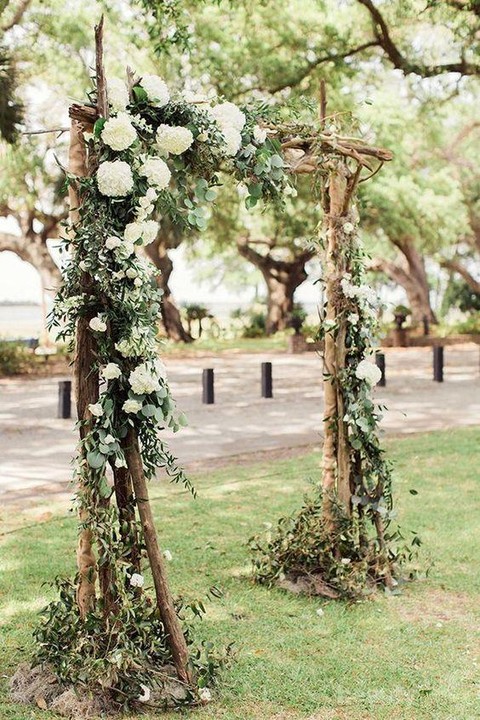 Rustic decoration biasanya identik dengan warna-warna off white, cream, coklat, dove grey, hijau dan warna-warna smoooth lainnya. Dalam pemilihan Arch atau pelaminan tentunya kamu harus memilih kayu berwarna coklat yang dipadukan dengan kain tile, juga di dominasikan dengan bunga atau tanaman hijau untuk menambah kesan natural. Jika kamu akan mengadakan pesta pada malam hari, kamu bisa tambahkan lampu-lampu kecil di pinggiran kayu untuk menambah kesan yang glamour tetapi tetap klasik. Sesuaikan juga warna lampu dengan tema pernikahan,pilihlah lampu-lampu kecil berwarna putih.