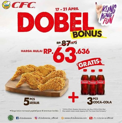 Foto: https://www.instagram.com/cfcindonesia_official/Nah untuk kalian yang lagi pingin makan junk food, mau ayam goreng yang lagi promo? Nah, pas banget nih CFC Dobel Bonus (5 Pcs Ayam + 3 Pcs Coca-cola) yang harganya mulai dari Rp. 63.636. Promo ini berlaku dari 17-21 April 2019 di seluruh gerai CFC. Kalian nggak boleh melewatkan promo ini! Kalian bisa ajak teman-teman atau keluarga setelah nyoblos!