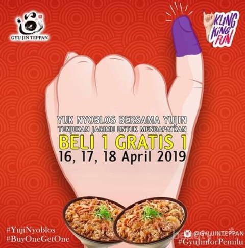 Foto: https://www.instagram.com/gyujinteppan/Kalian enggak boleh melewatkan promo beli satu gratis satu ini ladies! Kapan lagi? Promo pemilu 2019 “Buy One Get One” ini berlaku untuk menu Original Gyu atau Tori Teppan. Promo ini belaku dari tanggal 16 – 18 April 2019. Gunakan suara kalian untuk mendapat promo ini ya!