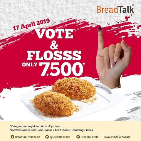 Foto: https://www.instagram.com/breadtalkindo/Selanjutnya adalah Bread Talk. Gunakan hak pilihmu pada pemilihan presiden 2019 dan dapatkan promo harga khusus untuk setiap pembelian roti floss di Bread Talk. Caranya mudah, tunjukkan jari ungu kamu kepada kasir dan dapatkan semua varian Flosss seharga Rp. 7500.