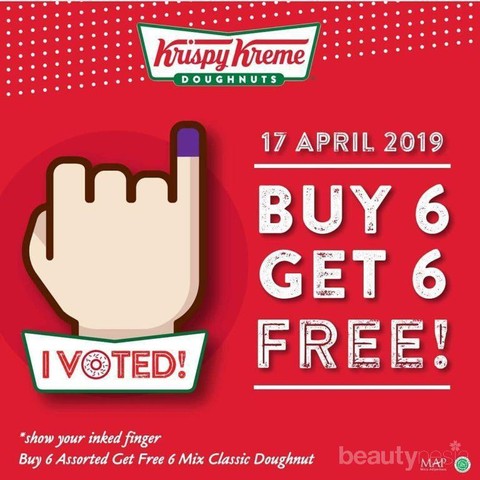 Foto: https://www.instagram.com/krispykremeid/Siapa nih yang suka banget makan donat? Kalau kalian suka banget sama donatnya Krispy Kreme dan pingin juga dapat promonya, maka kalian harus menggunakan hak pilih kalian ya. Jangan golput! Spesial di 17 April 2019, kamu bisa mendapatkan Buy 6 Get 6 Free. Setiap pembelian 6 Assorted akan mendapatkan 6 Mix Classic Doughnut.