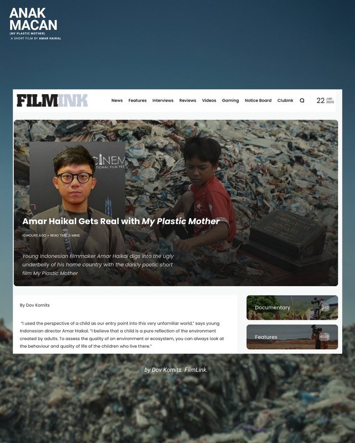 Kabar tersebut dibagikan pada 1 Februari 2026 melalui akun Instagram resmi Podium Pictures, rumah produksi di balik karya sutradara Amar Haikal. Dalam unggahannya, Podium Pictures menuliskan, “Anak Macan (My Plastic Mother) wins the Best International Short Film competition at the 35th Flickerfest International Short Film Festival!” Unggahan itu juga menyebutkan bahwa festival berlangsung selama 10 hari dan menyampaikan apresiasi kepada dewan juri atas penghargaan yang diberikan.