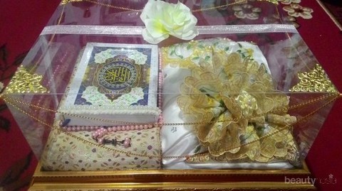 Hal inti yang tak boleh ketinggalan saat kamu menyiapkan seserahan ke mempelai wanita adalah seperangkat alat sholat. Kamu bia membawakan mukena, sajadah, Al-Qur'an, serta tasbih untuk melengkapi seserahan ini. Pilihlah mukena berwarna putih untuk melambangkan kesucian cintamu kepada calon istrimu.