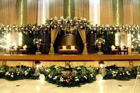 Foto: https://id.pinterest.com/Dekorasi yang terakhir ini cukup mewah dengan pelaminan yang besar di atas panggung. Pencahayaan yang dipilih juga menampilkan kesan yang mewah dan berkelas. Seperti dekorasi-dekorasi sebelumnya, masih terdapat aksen kayu ukir di bagian latar. Di bagian atas pelaminan, dirangkai bunga-bunga berwarna pastel yang kalem dan adem dipandang mata. Cantik banget kan, Ladies?