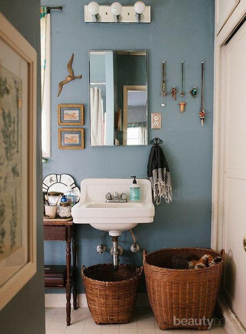 Foto: https://id.pinterest.com/pin/813322013933378568/ Berikutnya ada dekorasi unik di sekitar washtuffle nih. Lihat deh, kesannya emang berpadu banget. Warna biru yang gelap dipadu dengan warna washtuffle yang putih serta bakul yang terbuat dari bambu emang membuat kesan yang terlihat begitu berpadu. Secara keseluruhan emang terlihat unik. Nuasa klasik dengan tambahan sedikit nuansa modern menjadi hal yang paling menonjol disini.