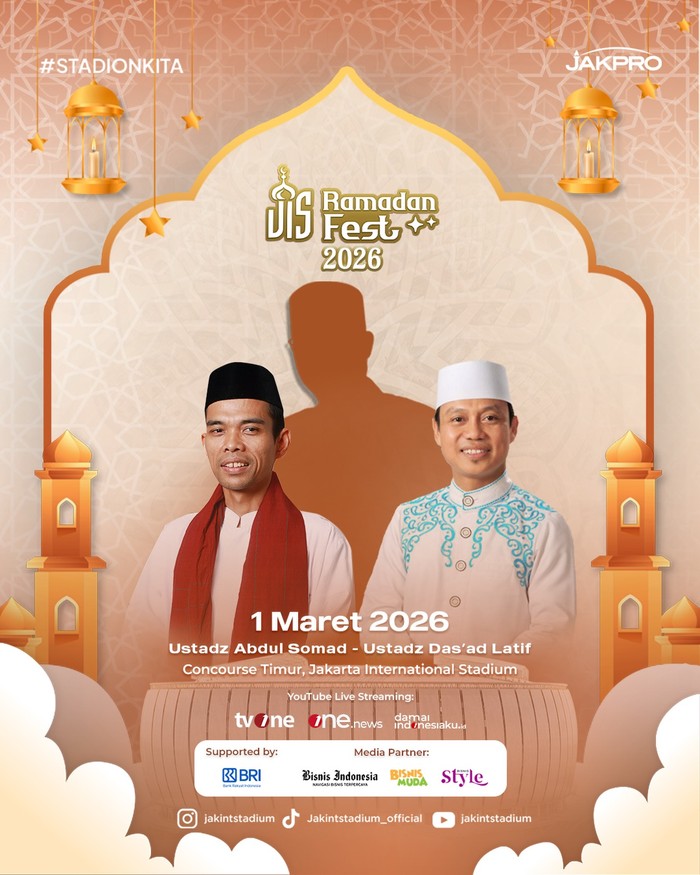 JIS Ramadan Fest 2026 kembali hadir di Jakarta International Stadium. Event ini dilaksanakan pada tanggal 1 Maret 2026 dengan rangkaian acara talkshow, buka puasa bersama, tarawih bersama, dan hiburan lainnya. Acara ini akan diisi oleh banyak ulama dan juga Ustadz Abdul Somad dan Ustadz Das’ad Latif. Event JIS Ramadan Fest ini gratis, Beauties!
