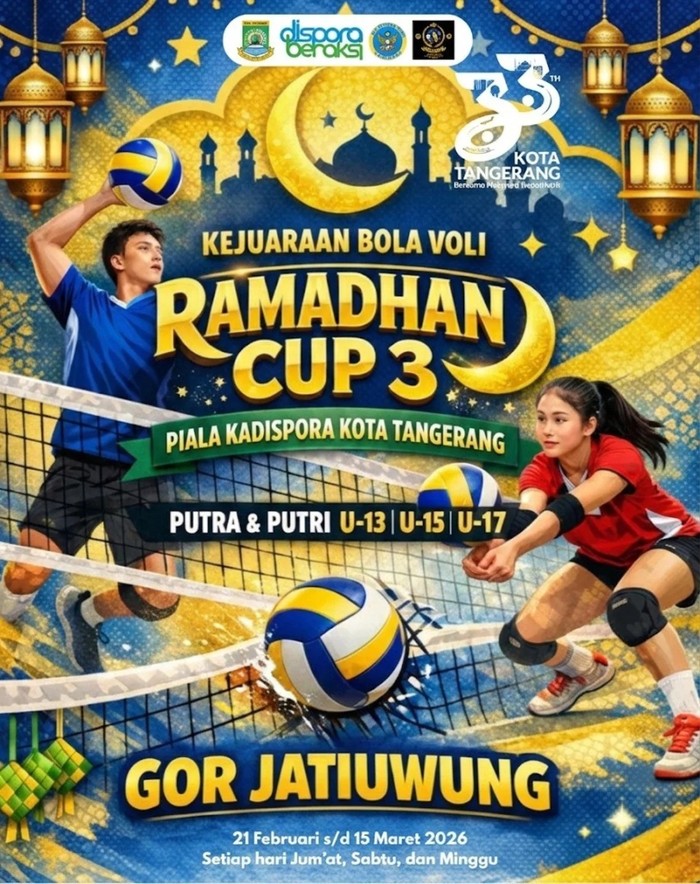 Turnamen Bola Voli Ramadan Cup III piala Kadispora Kota Tangerang 2026 hadir kembali. Turnamen ini jadi salah satu ajang paling dinanti di bulan Ramadan. Digelar di GOR Jatiuwung, Tangerang, turnamen ini akan berlangsung pada 21 Februari hingga 12 Maret 2026.