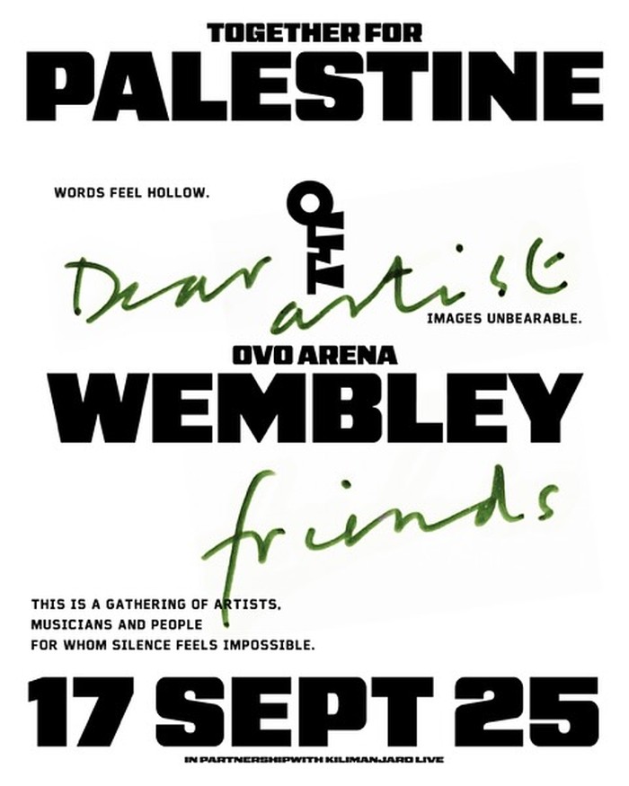 Konser musik amal berskala global bertajuk “Together for Palestine” akan digelar di Wembley Arena, London, pada 17 September 2025. Konser berskala internasional ini digarap oleh musisi legendaris Brian Eno. Acara ini akan menampilkan panggung pertunjukan deretan musisi papan atas dunia demi menggalang dana untuk Choose Love, sebuah organisasi amal Inggris yang menyalurkan bantuan kemanusiaan ke Gaza.