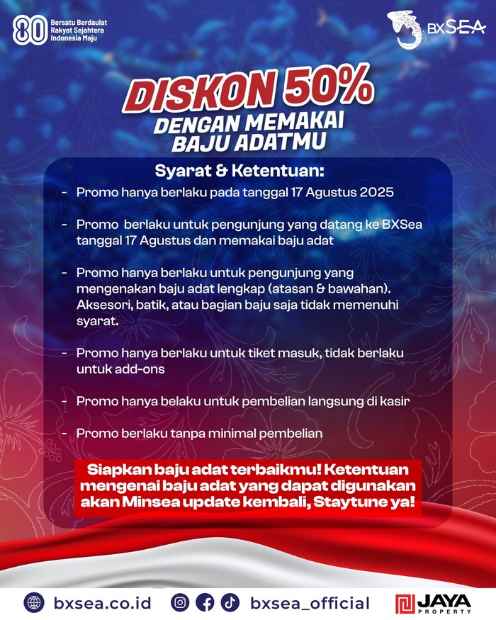 Dalam merayakan kemerdekaan RI, BXSea punya promo dan challenge yang menarik khusus di tanggal 17 Agustus 2025. Kamu berkesempatan mendapatkan diskon 50% tiket masuk dengan memakai baju adat lengkap (atasan dan bawahan). Promo tidak berlaku kalau kamu hanya menggunakan aksesori, batik, atau baju adat saja. Info selengkapnya, klik di sini ya!