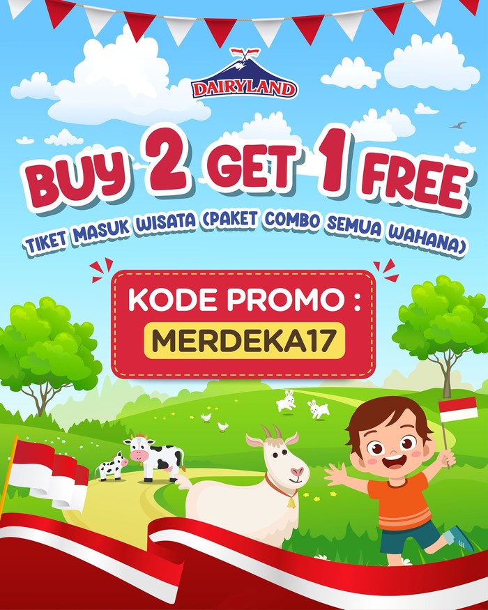 Cimory Dairyland punya promo spesial di hari kemerdekaan yaitu BUY 2 GET 1 FREE. Promo ini berlaku dari tanggal 3-17 Agustus 2025. Satu akun hanya bisa mendapatkan 1 tiket gratis (tidak berlaku kelipatan). Tiket gratis hanya bisa digunakan di hari yang sama dengan tiket berbayar. Promo ini bisa didapatkan dengan pembelian Paket Combo Wisata via website resmi. Jangan lupa masukan kode promo MERDEKA17 untuk mendapatkan tiket gratisnya. Info selengkapnya, cek di sini ya!