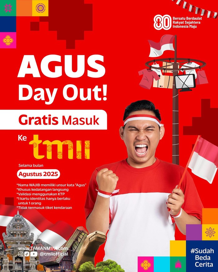 TMII memanggil seluruh nama “Agus” di Indonesia untuk berkunjung karena TMII memberikan tiket masuk TMII secara gratis. Bagi pemilik nama dengan unsur Agus, kamu bisa datang langsung dengan menunjukkan KTP. 1 kartu identitas hanya berlaku untuk 1 tiket. Tiket tidak termasuk dengan tiket kendaraan. Promo ini berlaku selama Agustus 2025. Info selengkapnya, cek di sini ya!