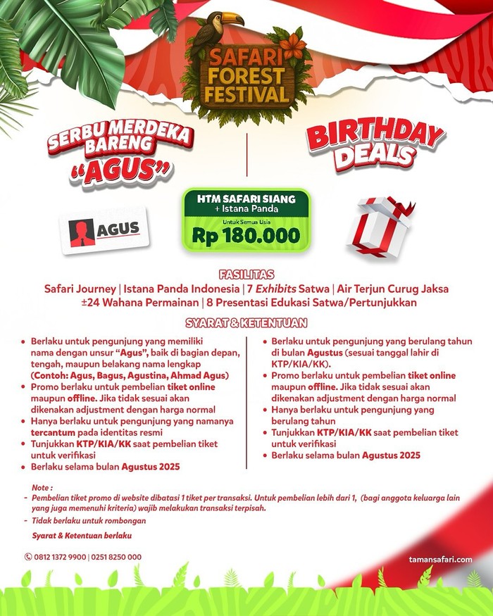 Di bulan kemerdekaan ini, Taman Safari menawarkan promo yang menarik yang berlaku selama bulan Agustus 2025. Promo spesial buat kamu yang namanya ada unsur “Agus”, baik nama depan, tengah, atau belakang bisa mendapatkan harga tiket masuk spesial hanya Rp 180.000.