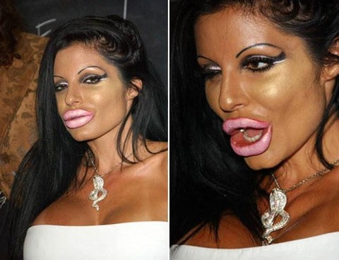 Karena gagal operasi plastik, kedua wajah dalam foto di atas berubah menjadi menyeramkan. Pada foto pertama wanita tersebut tampak seperti kucing dengan mata yang ditarik meruncing pada bagian sudut luar. Yakin masih mau operasi plastik?