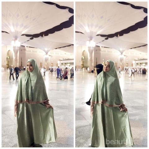 Sungguh anggun dan memesona look Gigi dengan menggunakan satu set busana musim Syar’i saat ia sedang menjalankan ibadah umrah beberapa waktu lalu. Tak perlu menggunakan aksesoris yang berlebihan, Gigi bahkan terlihat sangat anggun dan cantik menggunakan outfit yang sederhana.