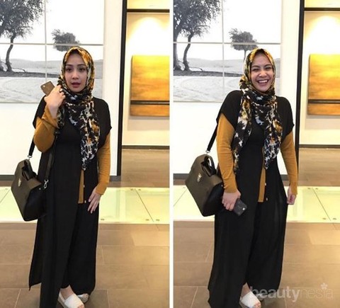 Wah gaya Gigi yang satu ini miriip para selebgram yang fashionable banget ya hijabers. Menggunakan long outer yang dipadankan dengan kaos panjang berwarna senada dengan hijab, Gigi tampak modis banget!