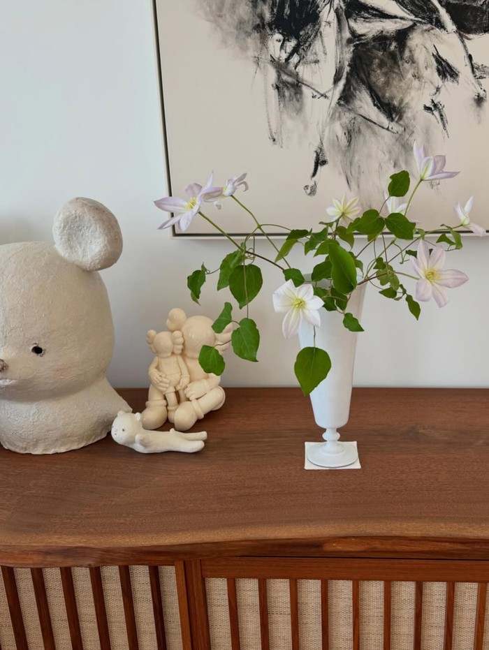 Min Hyo Rin memilih untuk menempatkan bunga kecil yang telah dipotong sebagai hiasan di tempat yang tidak biasa alih-alih di meja atau di pusat ruangan.