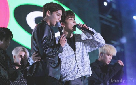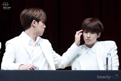 Foto: IstimewaTak hanya menunjukkan kedekatan dengan selalu duduk berdekatan, Mingyu dan Wonwoo juga menunjukkan kedekatan lewat bahasa tubuh mereka. Dalam sebuah kesempatan Mingyu terlihat merapikan rambut Wonwoo di depan para fans.