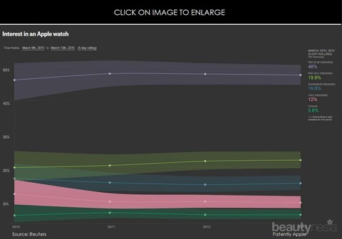 Survei mengejutkan datang dari situs reuters.com yang membuat polling tentang ketertarikan masyarakat tentang produk Apple Watch. Hasil survei menyatakan bahwa 69% warga Amerika tidak tertarik untuk memiliki Apple Watch, yang sempat menjadi headline minggu-minggu ini.