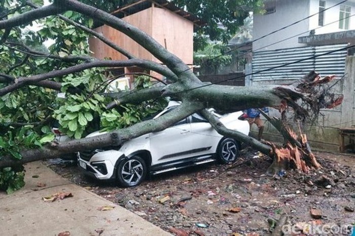 Mobil tertimpa pohon saat hujan/ Foto: detikcom/M Solihin