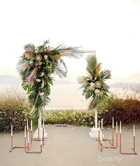 Pernah ngebayangin nggak kamu memanfaatkan elemen alam yang sudah tidak terpakai sebagai hiasan pernikahan. Misalnya saja daun dan bunga kering yang bisa diawetkan ini? Kamu bisa berkonsultasi dengan florist atau jasa dekorasi pernikahanmu untuk menyiapkannya.