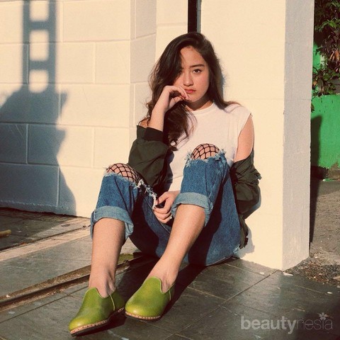 2. Supaya enggak mainstream, Salsha memilih ripped jeans dengan jaring-jaring di bagian lutut seperti ini untuk jadi celana andalan. Ditambah lagi dengan bomber jacket dan juga slip on leather shoes yang unik ini. Hits banget kan, Beautynesian?