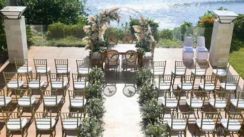 Foto: IstimewaTema ini mungkin sangat berbeda dari 4 tema di atas. Walaupun sama-sama diselenggarakan di pantai, namun untuk yang satu ini konsepnya semi outdoor. Para tamu tidak akan merasa terganggu dengan angin pantai yang cukup kencang, karena acara pernikahannya berada di sebuah ruangan terbuka.