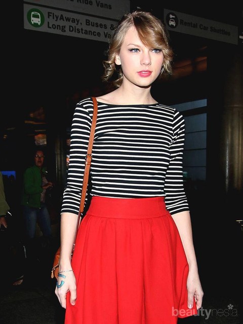 Taylor memilih untuk memakai T-shirtnya dengan rok merah yang cerah. Setelah melihat Taylor Swift, kamu dapat mempertimbangkan menggunakan T-shirt bergaris dengan warna yang cerah untuk menemani T-shirt simple ini.