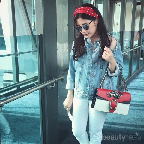 Dalam beberapa kesempatan, Prilly Latuconsina juga tampak mengambil inspirasi denim style sebagai statement. Ia memilih frayed jacket jeans untuk memberikan gaya yang sedikit boyish. Namun, dalam foto yang diunggahnya ke dalam akun instagram ini juga memerlihatkan sisi femininnya dengan aplikasi bandana slayer yang senada dengan tasnya.
