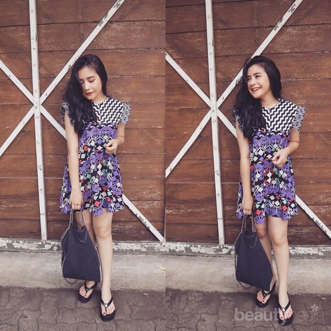 Cewek cantik ini ternyata tidak mau melewatkan batik sebagai gaya fashion-nya, lho! Lihat saja aplikasi batik dress yang dieksekusinya dengan gaya kasual. Ditemani item kasual lainnya, yaitu sandal dan juga tote bag hitam, membuatnya tampak cozy namun tetap fresh, kan!