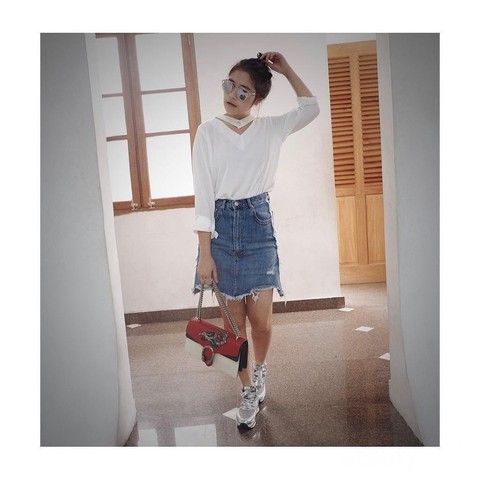 Gaya keren satu lagi dari Prilly Latuconsina adalah saat ia memadukan beraga model ripped denim dan memadukannya secara harmonis. Pesona denim style menjadi memikat dengan potongan rok mini yang dikombinasi bersama atasan berdetail over neck blouse. Kemudian ia masukan blouse ke dalam hip rok denimnya. Wah, stylish abis!